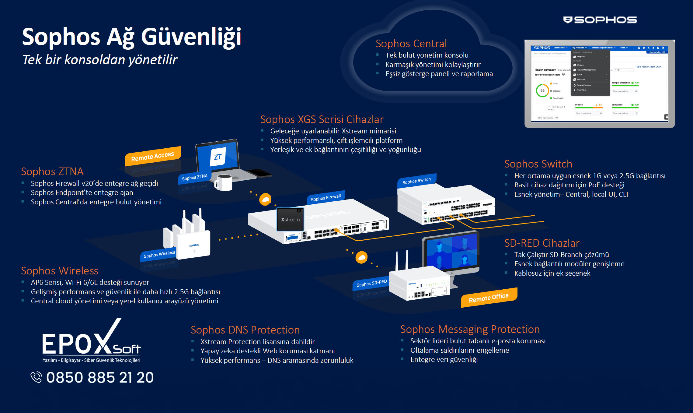 Sophos; firewall, endpoint koruma, XDR (Extended Detection and Response), MDR (Managed Detection and Response) ve bulut güvenliği gibi birçok farklı alanda entegre çözümler sunar. En önemli özelliği ise tüm bu sistemleri tek bir merkezden yönetilebilen bir yapı altında birleştirmesidir.